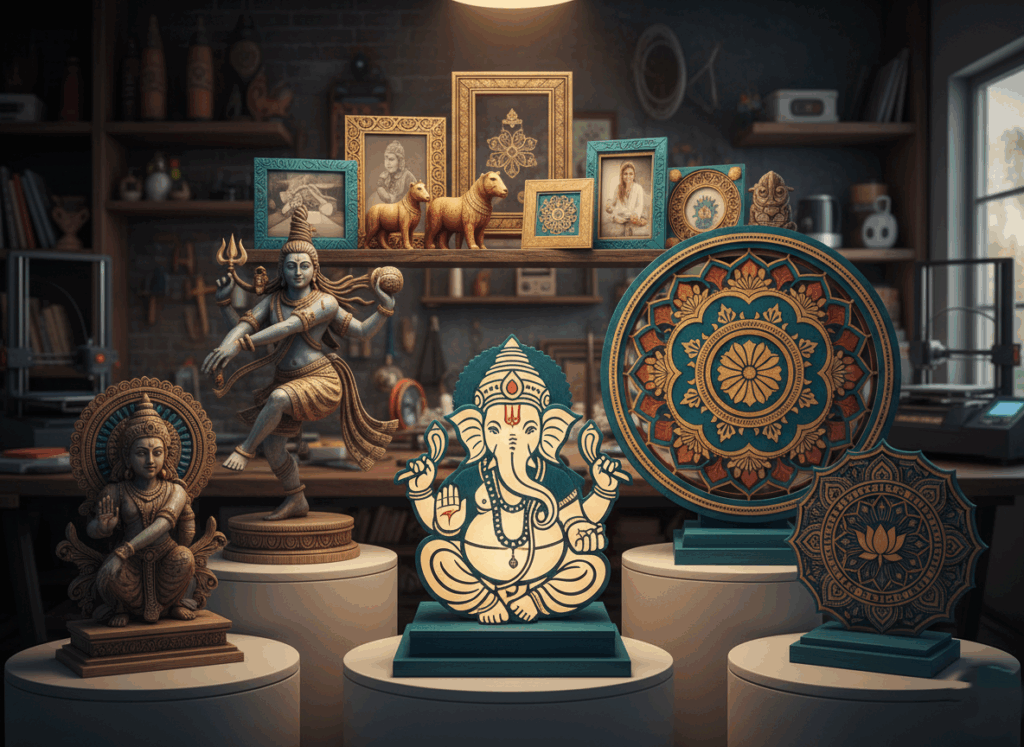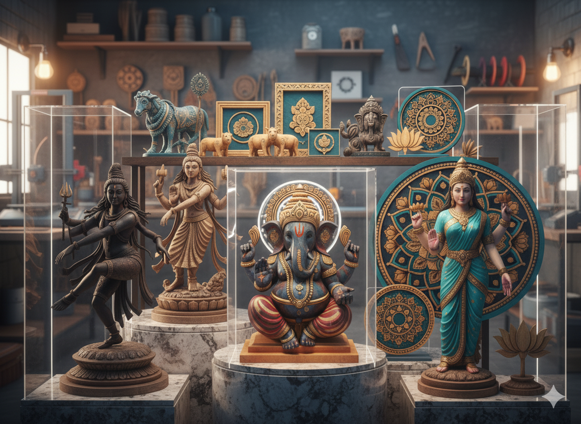 Our craftsmen combine traditional inspirations with cutting-edge technologies like 3D printing, laser engraving, and UV printing, ensuring each piece radiates authenticity and precision. From intricately designed idols and statues to contemporary wall art, keychains, and decorative accents, every creation reflects harmony between spirituality and modern aesthetics.