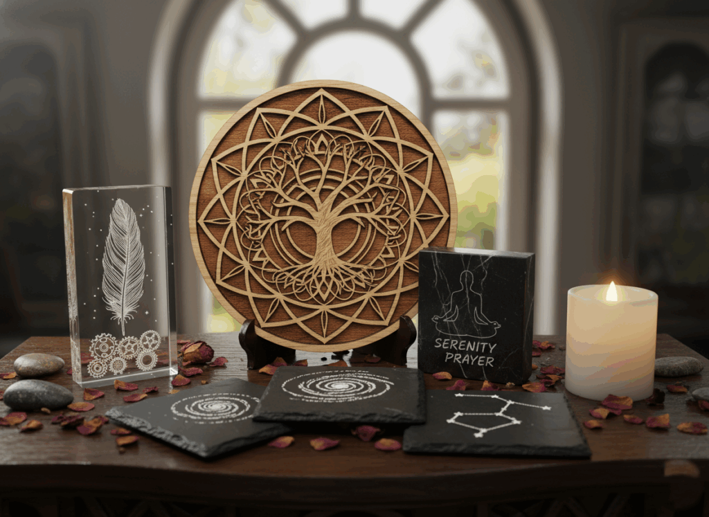 Experience precision and elegance with laser engraved pieces, perfect for meaningful gifts and sacred spaces.